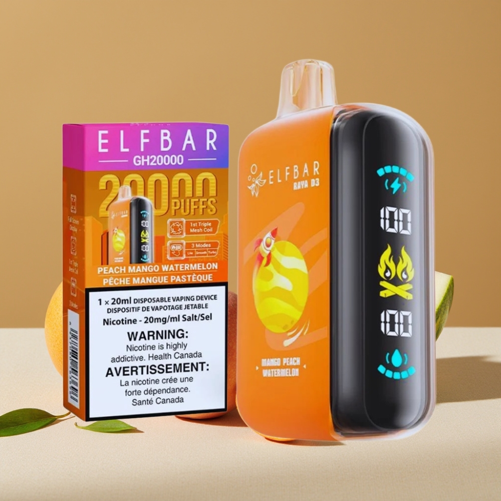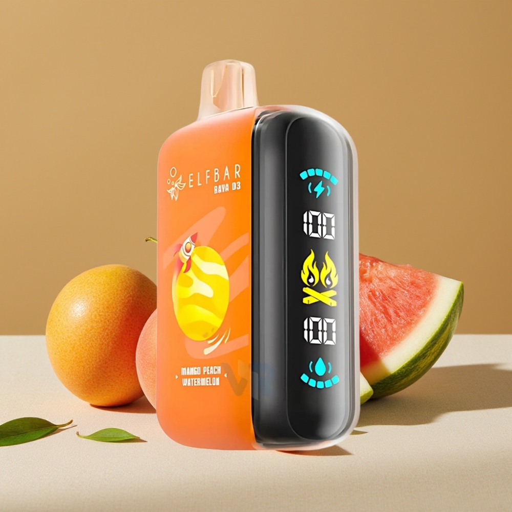 ELF BAR RAYA D3 25.000 Puffs Vape Desechable Recargable con Pantalla – 23ml, 5% Nicotina, Sabor Mango Melocotón Sandía