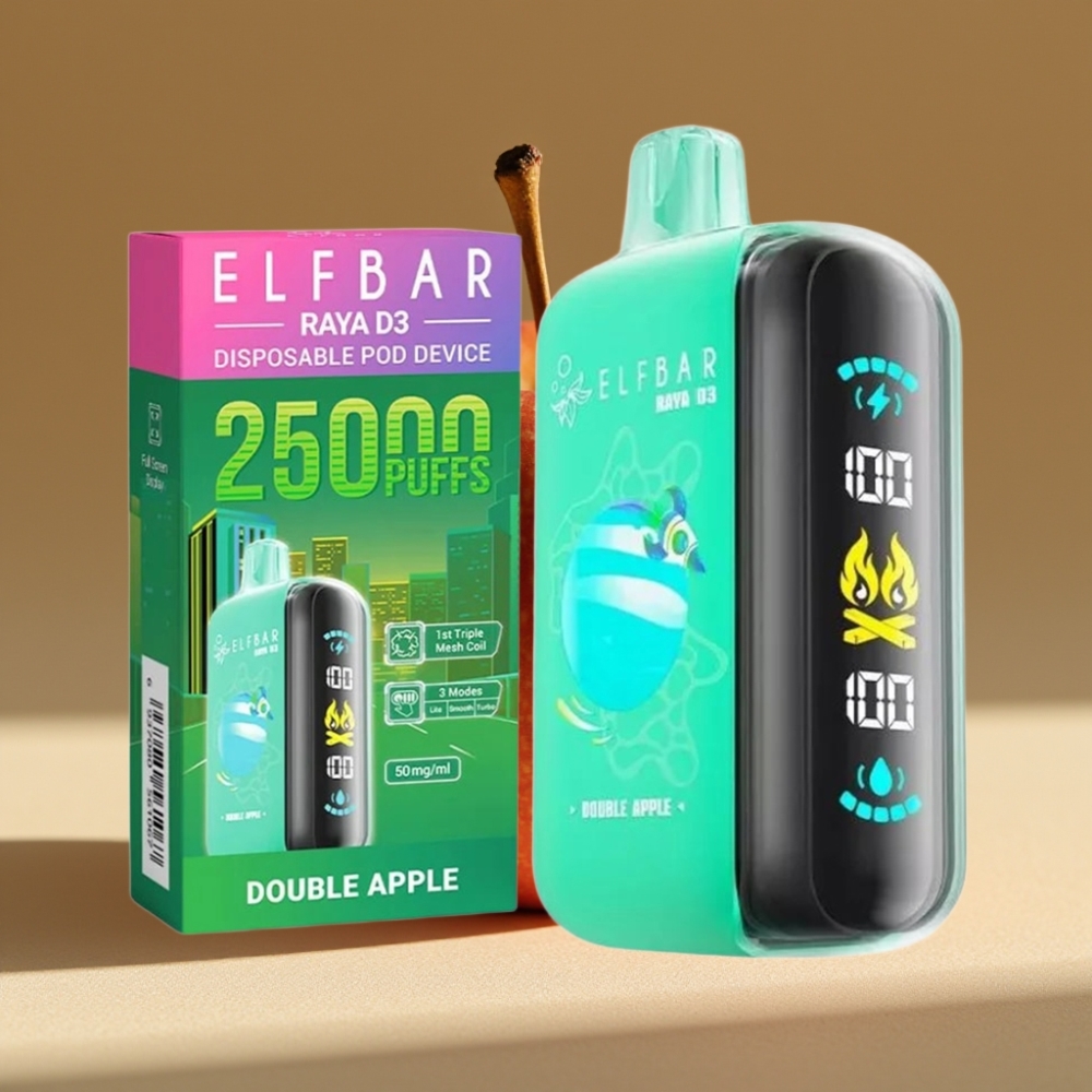 ELF BAR RAYA D3 25000 Puffs Desechable Vape Manzana Doble – 23ml, 5% Nicotina, Pantalla Grande, Recargable Tipo-C