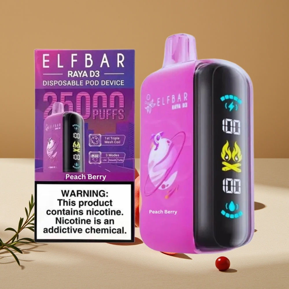 ELF BAR RAYA D3 25000 Puffs Vape Desechable Recargable 23ml 5% Nicotina – Durazno y Baya